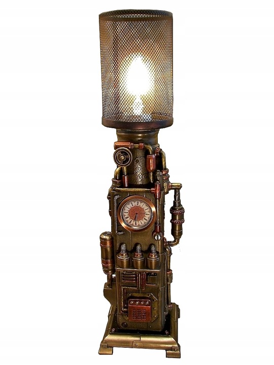 Pozývam vás k nákupu neobyčajnej lampy s hodinkami v štýle steampunk. Lampa pripomína nejaký neobvyklý parný stroj z 19. storočia, ktorého jediným účelom je napájanie hodín a lampy. Prenáša nás v čase do obdobia mimoriadnych vynálezov, fantastickej literatúry Juliusza Verna. Fantasticky sa prezentuje a nie je len netradičným gadgetom, ale poskytuje náladové svetlo a ukazuje čas. Predmet je precízne vyrobený z polyresinu, pokrytý bronzom, ručne maľovaný.